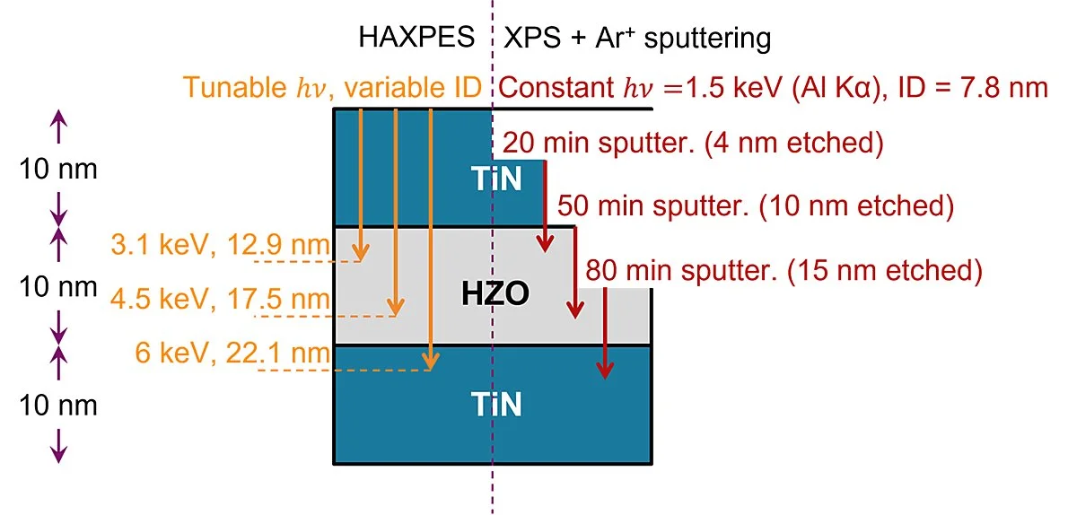 However, the performance and reliability of HZO-based devices are highly sensitive to the concentration and distribution of oxygen vacancies (VO), which influence phase stability, leakage currents, and endurance. Modest concentrations of VO optimize the orthorhombic phase but higher concentrations favor the non-polar tetragonal phase and lower concentrations the non-polar monoclinic ground state. This study presents a rigorous comparison between conventional X-ray Photoelectron Spectroscopy (XPS) and Hard X-ray Photoemission Spectroscopy (HAXPES) for quantifying VO in ultra-thin ferroelectric capacitors. The authors demonstrate that Ar⁺ ion sputtering used in XPS depth profiling introduces significant artifacts, leading to overestimation of VO concentrations by up to an order of magnitude. In contrast, HAXPES provides accurate, non-destructive measurements, revealing realistic VO levels around 1%.